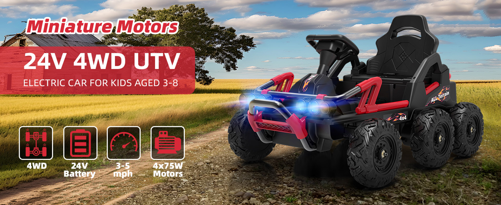 This UTV is made with a steel frame as chassis and bumper, which is extremely durable and can hold weights up to 132 lbs. The seat is spacious enough to occupy a child over 50 inches tall. This seat is adjustable forward and backward to accommodate different leg length. We specifically equipped this UTV with a 24V 7Ah battery, that can run 60-80 minutes. It also has quadruple 75W motors enabling the vehicle to reach 3-5 mph which can easily climb most 20 degrees slopes. Since UTVs are made to handle rough terrains, we placed in 4 independent suspensions with 6 EVA tires to make this vehicle have fun on all terrains.